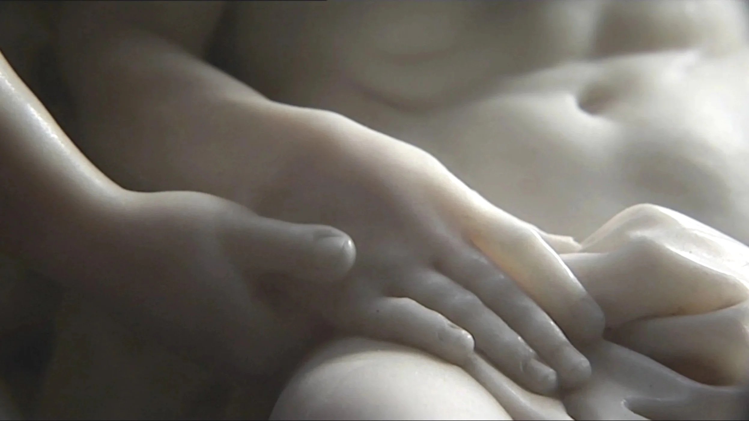 In Plura the camera moves slowly across the surface of a classical statue carved in marble. From time to time a hand, cheek or thigh move into the frame. The imagery is accompanied by a soundtrack of male and female voices; guttural and indistinct sounds which seem to struggle with language and the recollection of specific forms and meanings – the beginnings of words, the start of sentences, conversations, and relationships imbue the figures with an emotive connection and function to shift the classical bodies from cold stone to an intimate and human composition. The viewer is frustrated from seeing the sculpture, of Diana embracing the sleeping Endymion, in its entirety.